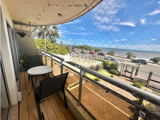 Amplio living con aire acondicionado y cocina integrada con barra desayunador, muebles aéreos y bajo mesada, salida a balcón con hermosa vista hacia la rambla.