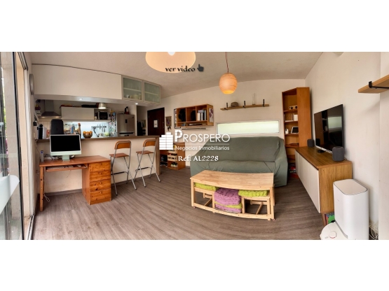 Living-comedor con salida a patio con parrillero, cocina integrada con barra desayunadora, muebles aéreos y bajo mesada.